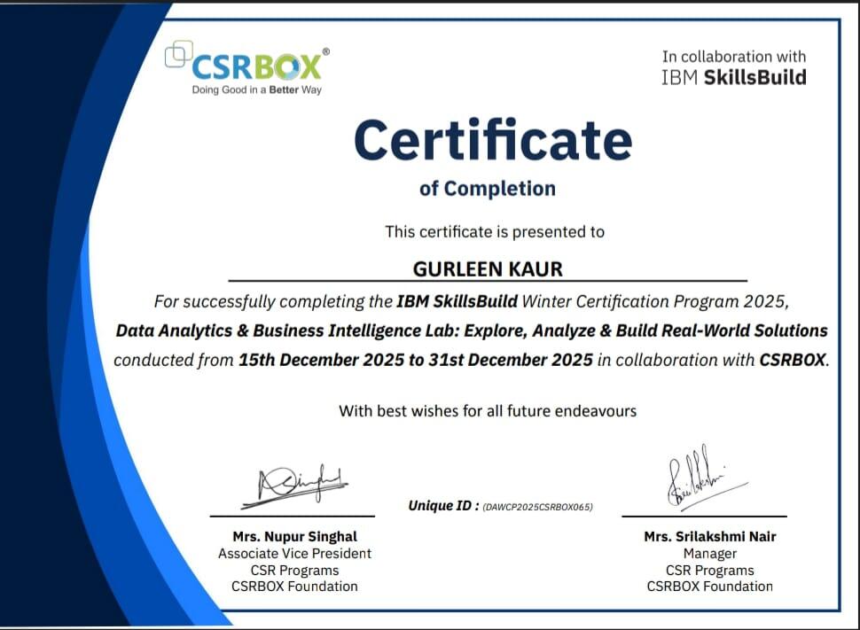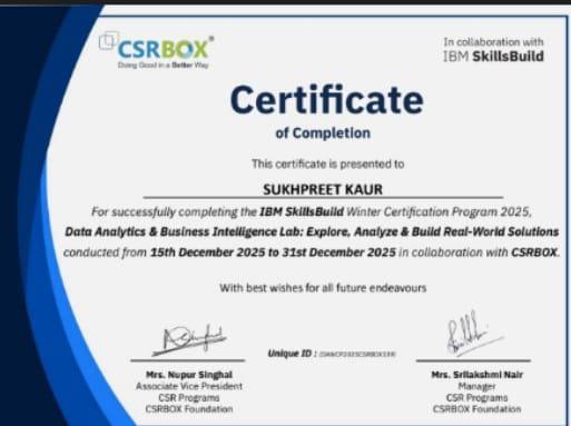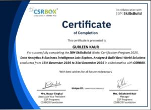 IIC Cell also arranged Two-weeks workshop on Data Analytics & Business Intelligence Lab: Explore, Analyze & Build Real-World Solutions in online mode which was conducted by IBM SkillsBuild in collaboration with CSRBOX from 15th – 31st December, 2025 . Total 60 students were enrolled in this program and 6 students successfully completed this course and received certificates.